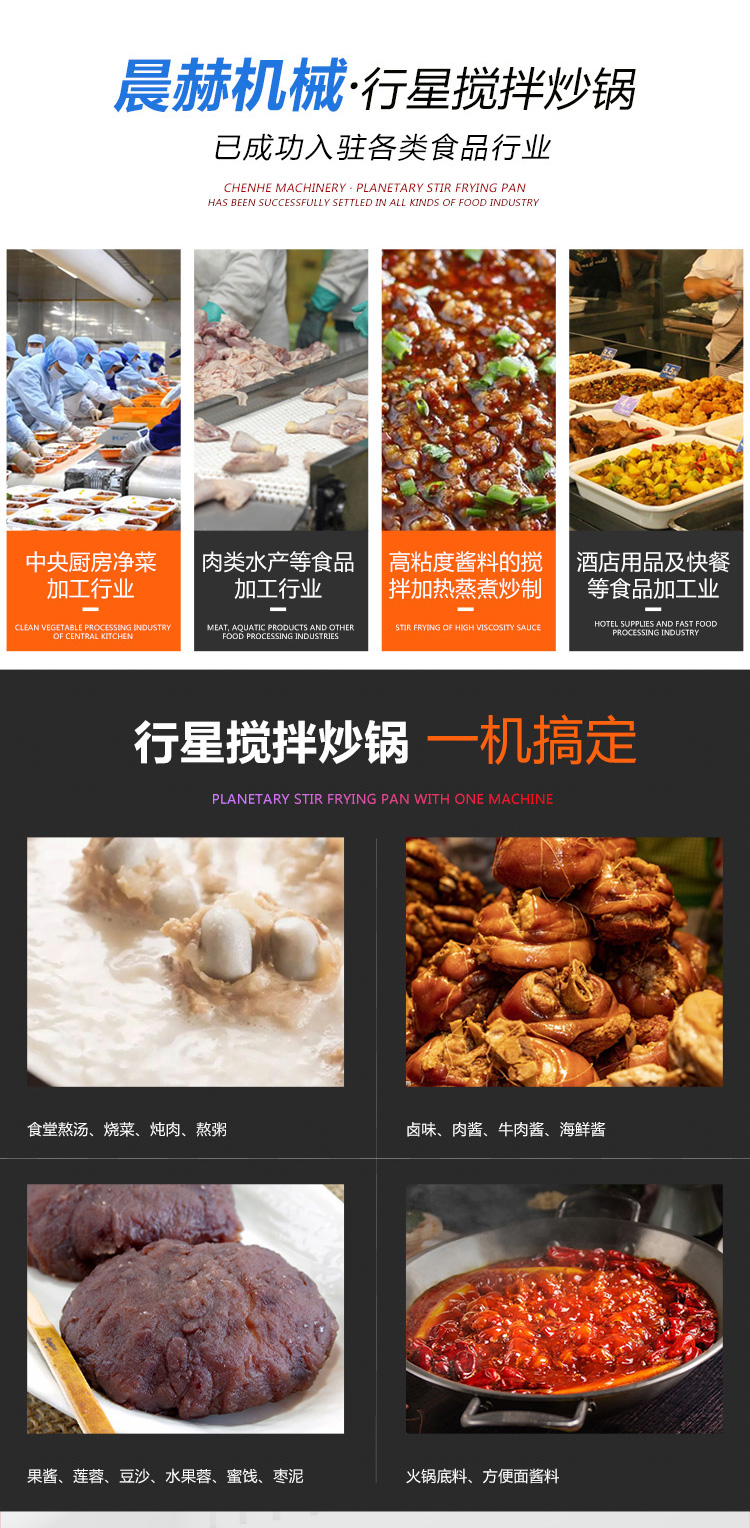 行星炒鍋、攪拌鍋、電磁炒鍋、蒸煮鍋、滾揉機、斬拌機、清洗風(fēng)干流水線等產(chǎn)品